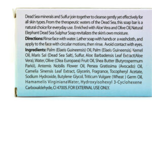 Os minerais e o enxofre do Mar Morto se unem para limpar de forma suave e eficaz todos os tipos de pele. Das águas terapêuticas do Mar Morto, esta barra de sabonete é uma escolha natural para o uso diário. Enriquecido com aloe vera e azeite de oliva, o sabonete natural de enxofre para elefantes do Mar Morto revitaliza a umidade da pele. – LIMPE – Trate todos os tipos de pele com este tratamento de enxofre e minerais do Mar Morto. – ENRIQUECIDO – O sabonete natural de enxofre para elefantes contém aloe vera e azeite de oliva para nutrir a pele. – MULTIAÇÃO – Pode ser usado para tratar manchas no corpo e também pode ser usado para combater a acne, a psoríase ásis e muito mais em seu rosto. – TERAPÊUTICO- Este poderoso tratamento pode ser usado para eliminar espinhas e outros irritantes da pele. O Mar Morto contém 21 minerais poderosos que melhoram a saúde da pele. – SATISFAÇÃO GARANTIDA – Garantimos que, se você não gostar do nosso produto nos primeiros 30 dias, poderá devolvê-lo para obter um reembolso total. Entre em contato conosco se tiver alguma dúvida sobre este ou qualquer um dos nossos produtos.