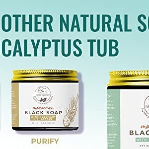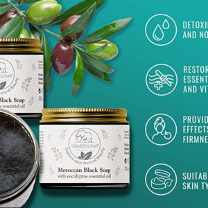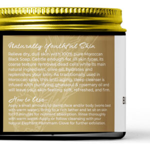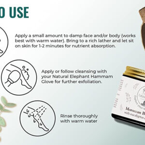 Alivie a pele seca e opaca com sabonete preto marroquino 100% puro. Suave o suficiente para todos os tipos de pele, sua textura grossa remove as células mortas, enquanto seu principal ingrediente natural, o azeite, hidrata e reabastece a pele. Tradicionalmente usado em spas marroquinos, este limpador profundo e antienvelhecimento é infundido com óleo essencial de eucalipto relaxante e deixará sua pele macia, revigorada e firme. – Criado com os mesmos ingredientes dos sabonetes encontrados nas saunas a vapor marroquinas, o sabão preto marroquino Natural Elephant com pó de alecrim e argila Ghassoul é uma pasta 100% vegetal cheia de azeite, óleo de eucalipto e sal. Sua textura grossa remove as células mortas da superfície da pele. – Também conhecido como Savon Noir, esse sabonete deixa a pele nutrida e sedosa. – Projetado para todos os tipos de pele, o sabonete preto marroquino com eucalipto Natural Elephants é ideal para rosto e corpo. – Aplique no rosto ou no corpo depois de umedecido. Deixe o sabonete descansar por 1-2 minutos. Depois de deixar o sabão descansar, enxágue bem com água morna. Isso é auxiliado pela luva Natural Elephant Hammam para adicionar mais esfoliação.