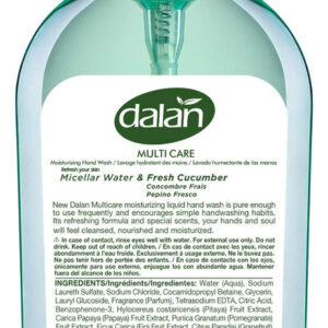 O novo sabonete em creme ultra-hidratante para lavar as mãos é feito com um toque de creme para reter a umidade e deixar suas mãos limpas e macias. Satisfaça suas mãos com o aroma revigorante do pepino fresco. Ingredientes/Ingredientes: Água (Aqua), Lauril Sulfato de Sódio, Cloreto de Sódio, Cocamidopropil Betaína, Glicerina, Lauril Glucosídeo, Fragrância (Parfum), Ácido Cítrico, EDTA tetrassódico, Benzofenona-3, Extrato de Folha de Aloe Barbadensis, Extrato de Theobroma Cacao (Cacau), Cocos Nucifera (Coco) Extrato de fruta, extrato de folha de Persea Gratissima (abacate), extrato de noz de Butyrospermum Parkii (karité), copolímero de estireno/acrilatos, coco-glicosídeo, trietilenoglicol, propilenoglicol, álcool benzílico, metilcloroisotiazolinona, metilisotiazolinona, hexil cinamal, Limoneno, linalol, amarelo 5 (CI 19140), verde 5 (CI 61570). O novo sabonete em creme ultra-hidratante para lavar as mãos é feito com um toque de creme para reter a umidade. Sabonete líquido para mãos feito com pepino fresco e outros ingredientes cuidadosamente escolhidos. Satisfaça suas mãos com a fragrância refrescante. Fragrância fresca de pepino. Testado dermatologicamente. Sem parabenos, silicone, álcool, PEG e SLS. Além disso, você pode usar dispensadores de sabão padrão. A Dalan's produz sabonetes para as mãos livres de crueldade. Nenhum de nossos produtos foi testado em animais. – O novo sabonete multicare ultra-hidratante para lavar as mãos é feito com um toque de creme para reter a umidade. – Sabonete líquido feito com pepino fresco e outros ingredientes cuidadosamente escolhidos. – Satisfaça suas mãos com a fragrância refrescante. Fragrância fresca de pepino. Testado dermatologicamente. – Sem parabenos, silício, álcool, PEG e SLS. Além disso, você pode usar com dispensadores de sabonete padrão. – A Dalan's produz sabonetes para mãos livres de crueldade. Nenhum dos nossos produtos é testado em animais.