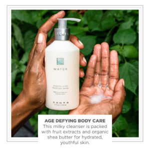 Camomila azul refrescante e renovadora, coentro, limão, hortelã e anis Sinta seu brilho. Este sabonete nutritivo para o corpo e as mãos encharca a pele com manteiga de karité 100% orgânica, pois remove as impurezas, para uma pele luxuosamente limpa e luxuosamente macia. Os extratos de cana-de-açúcar e frutas esfoliam suavemente sem partículas agressivas, revelando o brilho juvenil da pele. O aloe orgânico acelera a cicatrização e acalma os cortes causados pelo barbear. A flor de lótus desintoxicante restaura a pele macia, suave e saudável. Novo tamanho maior! Sabonete hidratante Ageless Aloe — cuidado corporal que desafia o envelhecimento. Ideal para peles sensíveis, este limpador leitoso contém extratos de frutas e manteiga de karité orgânica para uma pele jovem e hidratada. Para um banho de leite esfoliante de corpo inteiro, adicione algumas bombas de sabão na água morna do banho e deixe de molho para esfoliar as células mortas da pele. Use a lavagem diária para pia, chuveiro, barbear e tomar banho. – REFRESCANTE E RENOVADOR. Tão fresco e fresco quanto o Mar Mediterrâneo, The Water Collection é um aroma revigorante com notas de base profundas de camomila azul e coentro. Salpicos de limão, menta e erva-doce dão brilho a esse aroma. – RICAMENTE LIMPO. Remove as impurezas e age como um tratamento facial para as mãos e o corpo. Os extratos de cana-de-açúcar e frutas esfoliam suavemente sem partículas agressivas. Trate a lavagem das mãos como um ritual meditativo e faça com que cada experiência de banho pareça um spa. – INGREDIENTES NUTRITIVOS. A manteiga de karité rica e orgânica e o extrato de lótus suavizam e protegem a pele. A babosa orgânica acelera a cicatrização, acalma queimaduras solares e suaviza a pele. – LIMPA E CONSCIENTE. Nossos produtos são veganos, sem glúten, sem crueldade e formulados sem parabenos, ftalatos, propilenoglicol, petróleo, corantes, sulfatos e óleo de palma. Também amamos nosso planeta; os produtos e embalagens da ZENTS são feitos com um processo ecológico.