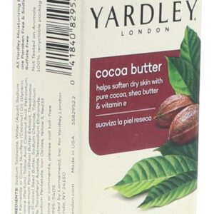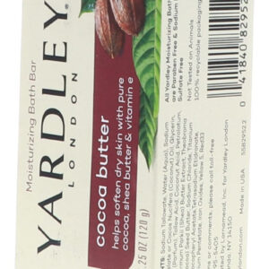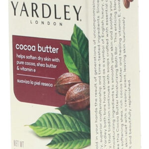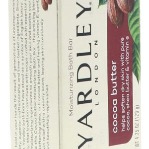 Sabonete em barra de manteiga de cacau puro e vitamina E Yardley London, 4,25 onças/120 g (pacote com 3) — Enriquecido com cacau puro, manteiga de karité e vitamina E — Delicioso aroma cremoso e espuma rica e luxuosa. Suaviza a pele seca – Deixa até mesmo a pele seca com uma sensação incrivelmente macia – Esta fórmula atraente com manteiga de karité e cacau e vitamina E combina o resgate da pele seca com um aroma rico e cremoso – Esta barra é muito rica e espumosa. É recomendado para uso diário. Armazene em local fresco e seco.