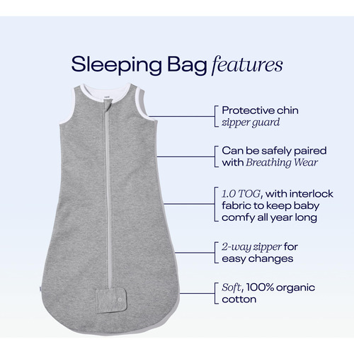 Saco de dormir Nanit Sleep Wear — médio, cinza mesclado — Uma alternativa segura para dormir, o saco de dormir Nanit Sleep Wear mantém os pequenos confortáveis o ano todo. Com bastante espaço para pernas pequenas se mexerem, chutarem e se esticarem, é o próximo passo para bebês ativos e após enfaixar. — Feito de algodão orgânico 100% certificado GOTS, lavável à máquina e pode ser secado — Zíper bidirecional para trocas rápidas de fraldas até tarde da noite; capa com zíper sem níquel, além de protetor de queixo para peles sensíveis — STANDARD 100 da OEKO-TEX — Pode ser combinada com segurança com todos os Nanit Breathing Wear