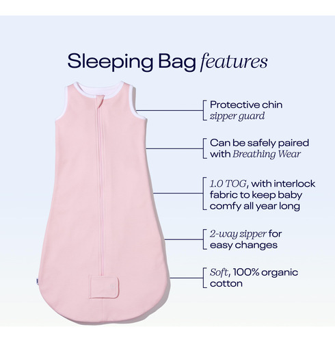 Saco de dormir Nanit Sleep Wear — médio, rosa — Uma alternativa segura para dormir, o saco de dormir Nanit Sleep Wear mantém os pequenos confortáveis durante todo o ano. Com bastante espaço para pernas pequenas se mexerem, chutarem e se esticarem, é o próximo passo para bebês ativos e após enfaixar. — Feito de algodão orgânico 100% certificado GOTS, lavável à máquina e pode ser secado — Zíper bidirecional para trocas rápidas de fraldas até tarde da noite; capa com zíper sem níquel, além de protetor de queixo para peles sensíveis — STANDARD 100 da OEKO-TEX — Pode ser combinada com segurança com todos os Nanit Breathing Wear