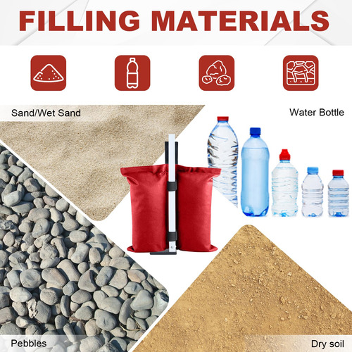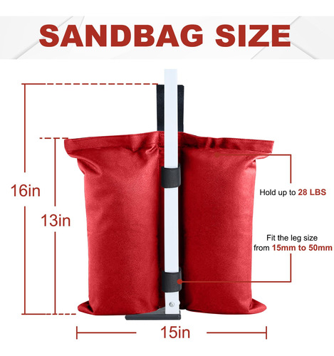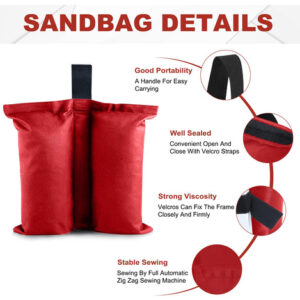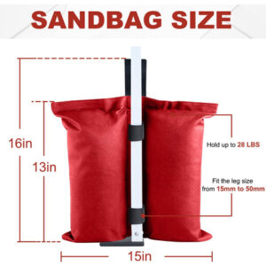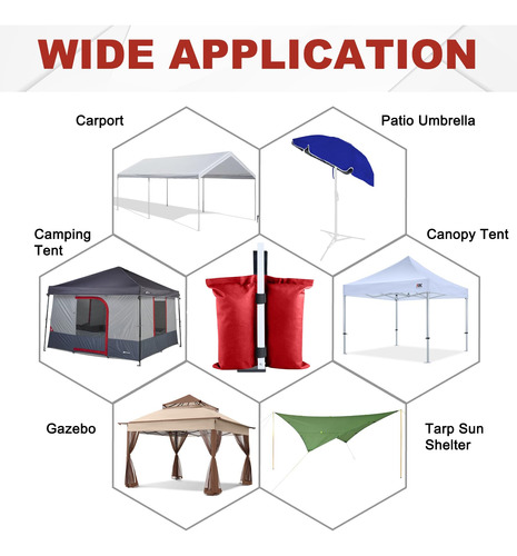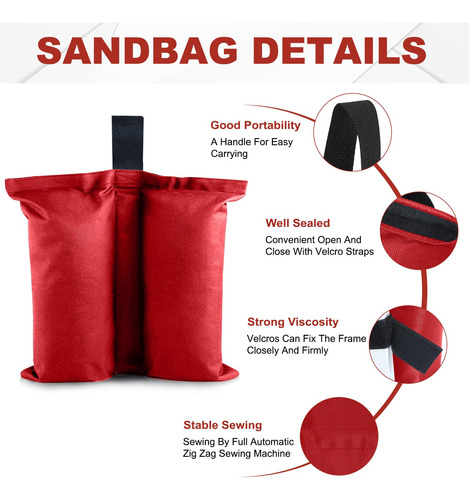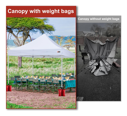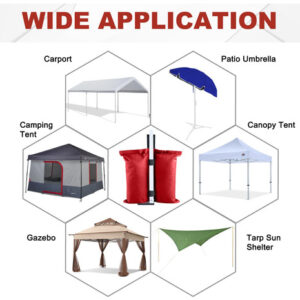 A ABCCANOPY fornece uma grande variedade de seleções de produtos de abrigo, como toldos dobráveis, gazebos, tendas de festa, guarda-sóis, tendas para festas e produtos relacionados, como paredes de dossel, tampos e estacas, etc., que são da melhor qualidade. Pois temos nossa própria fábrica (abrange 23.000 metros quadrados), o que nos permite cortar todas as cadeias intermediárias e controlar rigorosamente a qualidade de cada produto. Além disso, produtos personalizados (como toldos personalizados, tendas para festas, capas de mesa, guarda-sóis e bandeiras) também são fornecidos com tecnologia de impressão avançada. – Uso múltiplo: bolsa de peso ABCCANOPY (conjunto de 4 bolsas de peso) para qualquer barraca, gazebo (cabe no tamanho das pernas de 15 mm a 50 mm) e abrigos de acampamento, guarda-sol esportivo e trampolim. – Fácil de instalar: dois velcros é preso a cada bolsa de peso enquanto envolve a perna até a copa, permitindo que ela resista ao vento e a outros elementos climáticos! – Material de alta qualidade: feito de tecido impermeável de poliéster 1680D com PVC, durável e duradouro. – Boa flexibilidade: as bolsas de peso suportam até 28 libras em areia, rocha ou sujeira e são perfeitas para todas as superfícies. – NOTAS E NÃO ESTÃO INCLUÍDAS.