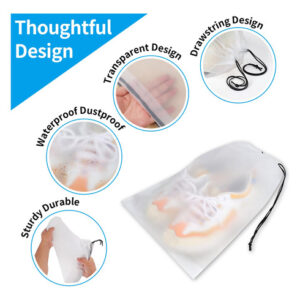 Bolsas de sapatos para viagens — Tamanho adequado: 15,7 x 11,8 polegadas; o pacote inclui 10 pacotes de bolsas de sapatos; tamanho ideal para mulheres e homens; ótima para embalar sapatos de dança, tênis, tênis, tênis de caminhada, tênis de golfe, roupas e outros itens de viagem; funciona bem como bolsa de armazenamento para casa e viagem — Multifuncional: não apenas como bolsa de viagem, também pode ser usada como bolsa de viagem, bolsa de higiene, bolsa de ginástica, lavanderia viagem de mala; se houver algum problema com as sacolas para sapatos, informe-nos e responderemos a tempo. Material premium: a bolsa para sapatos de viagem é feita de PE premium, impermeável e reutilizável; com cordões grossos para fácil pendurar e organizar rapidamente; um bom auxiliar para uso doméstico e em viagens – Design inteligente: o design translúcido das bolsas de sapatos para viagens ajuda você a identificar facilmente o que está dentro sem abri-las; economiza seu tempo e protege sua privacidade; conveniente para suas viagens e sua vida – Indispensáveis para viagens e uso diário: essas bolsas de sapatos para viagens podem proteger seus itens contra arranhões sujeira e sujeira, ajudam você a embalar a bagagem de forma conveniente e rápida e a manter seus sapatos bem organizados e livres de poeira; fazendo seu viagem e dia a dia convenientes e arrumados
