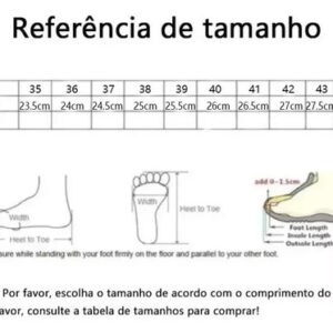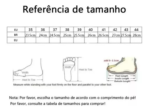Temos tamanhos padrão do Brasil, se você estiver confuso sobre o tamanho, escolha o tamanho correto de acordo com o comprimento do seu pé: se seus pés são mais grosso ou mais grosso, escolha um tamanho maior (+0,5 cm ou 1 cm)