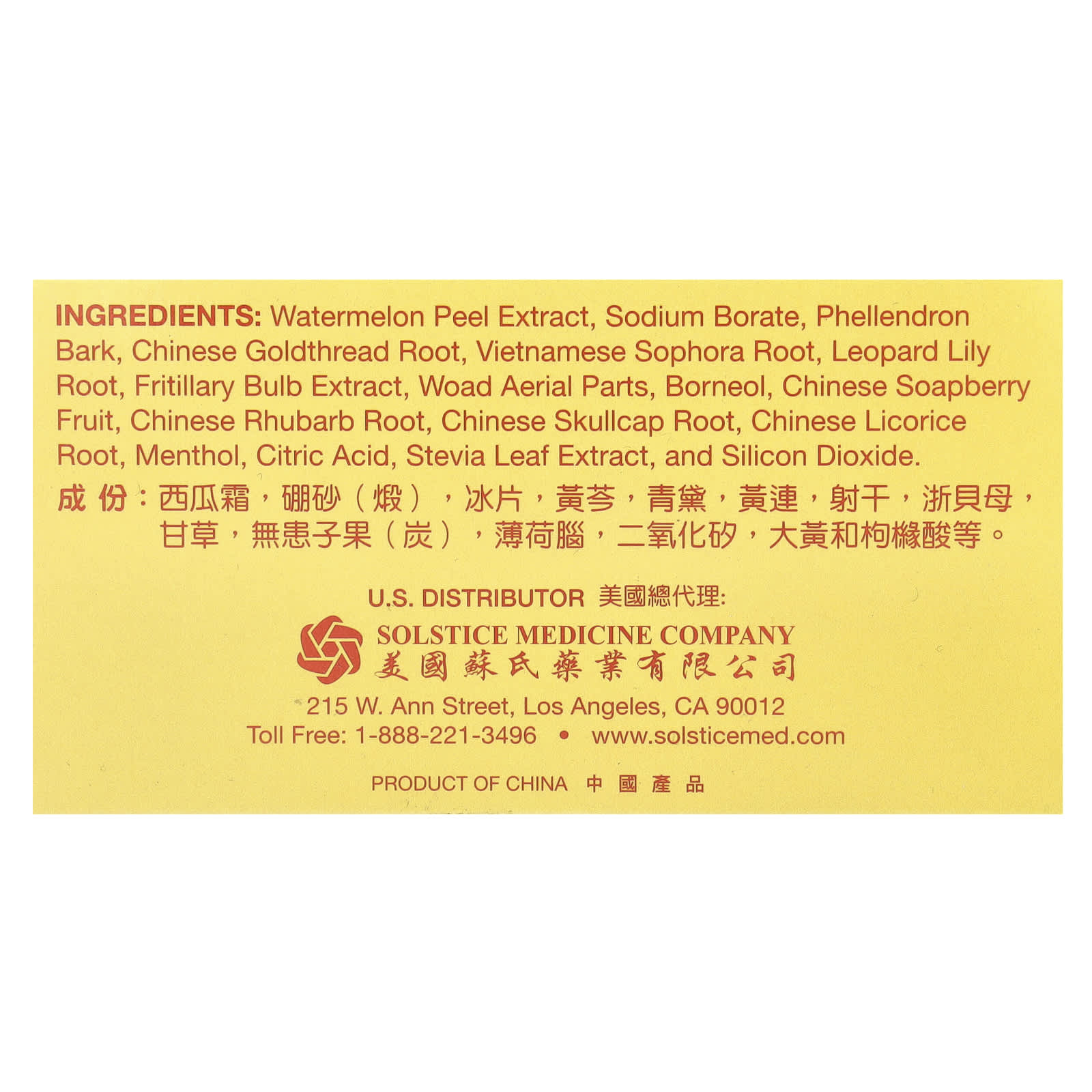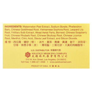 Extrato da casca de melancia, borato de sódio, casca de fellendron, raiz de fio de ouro chinês, raiz de Sophora vietnamita, raiz de lírio-leopardo, extrato do bulbo de Fritillary, partes aéreas woad, borneol, fruta de sabonete líquido chinês, raiz de ruibarbo chinês, raiz de Scutellaria lateriflora chinesa, raiz de alcaçuz chinês, mentol, ácido cítrico, extrato da folha de estévia, e dióxido de silício.