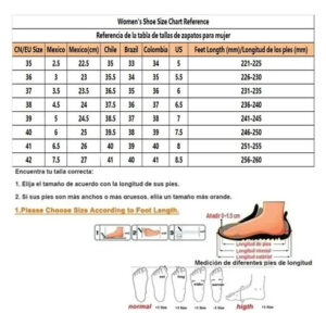 : Tamanho: A tabela de tamanhos é apenas para referência, escolha um tamanho de sapato maior se você tiver pés gordos, pés largos ou peito do pé alto. Antes ou depois de comprar sapatos, se você tiver alguma dúvida, entre em contato conosco a qualquer momento, faremos o possível para resolver seus problemas.
