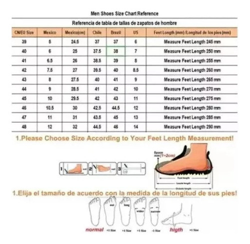 Tamanho: EU38=BR36, EU39=BR37, EU40=BR38, EU41=BR39, EU42=BR40, EU43=BR41, EU44=BR42, EU45=BR43, EU46=BR44