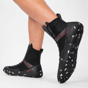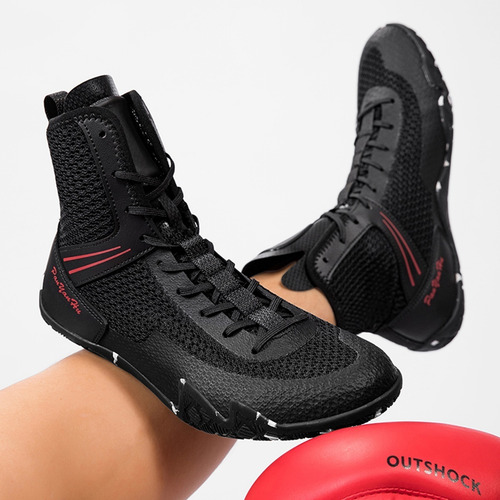design de cadarço com alça no tornozelo melhora o ajuste do sapato e permite maior flexibilidade de movimento. palmilha removível usa látex e EVA para conforto e amortecimento. Tênis de boxe híbridos para boxe e luta livre , luta e derrubadas. Ideal para academias e outros esportes indoor.