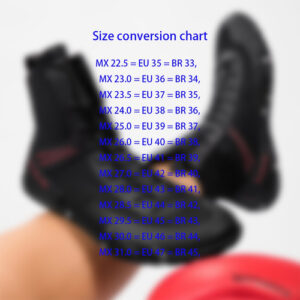 MX 31,0 = UE 47 = BR 45 = comprimento do pé (do pé ao calcanhar) 28,5 cm Descrição Tênis de boxe profissionais Sola de borracha antiderrapante de alto suporte e durabilidade Máxima aderência no ringue ou na academia. Capa alta Protege os tornozelos e reduz entorses.