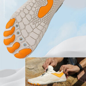 Design de bico largo e queda zero: nossos sapatos de caminhada com bico largo permitem que você experimente a máxima liberdade de movimento, permitindo que os dedos dos pés se estiquem e se estabilizem naturalmente. O salto zero promove uma postura naturalmente ereta, melhora o equilíbrio e reduz o estresse nas articulações. Ideal para quem procura uma verdadeira experiência descalça com maior proteção e conforto.