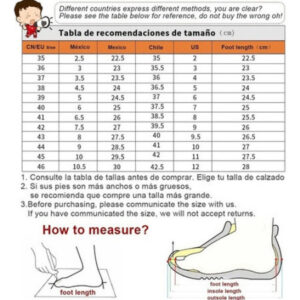 'Por favor, meça o comprimento dos pés antes de fazer o pedido. Encontre o tamanho ideal utilizando o guia que se encontra nas fotos do produto.