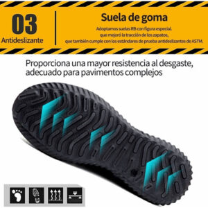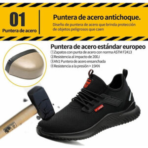 Zapatos de aço indestrutível: estes zapatos de seguridad para el trabajo con punta de acero indestrutível pueden suportar choques de 200 5J, comprovados de acordo com as normas de proteção laboral da UE. El kevlar es más liviano que el acero, pero tiene la misma resistencia a la perfuración, puede suportar la fuerza de punción de objetos afilados que excedem os 110 N e protege en gran la medida de su massa.