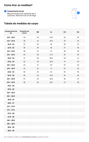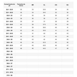 Meça primeiro o comprimento dos pés e depois faça o pedido de acordo com a tabela de tamanhos abaixo.