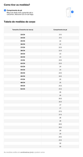 1. Nossas opções são o tamanho do fabricante: **EU/CN (ou seja, o número na etiqueta de tamanho do calçado), que corresponde ao tamanho **BR/BRA correspondente.
