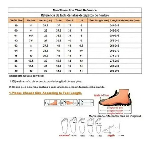 EU39=MX5=MX24.5(cm)=Feet length 24.5cm, EU40=MX6=MX25(cm)=Feet length 25cm, EU41=MX6.5=MX26(cm)=Feet length 25.5cm, EU42=MX7=MX27(cm)=Feet length 26cm, EU43=MX8=MX27.5(cm)=Feet length 26.5cm, EU44=MX9=MX28.5(cm)=Feet length 27cm, EU45=MX10=MX29.5(cm)=Feet length 27.5cm, EU46=MX10.5=MX30(cm)=Largo del pie 28cm, EU47=MX11.5=MX31(cm)=Largo del pie 28.5cm