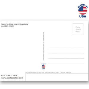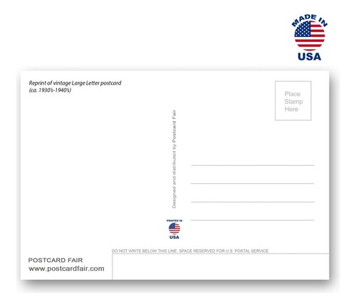 Our postcards are printed on 16 pt (360 gsm) premium quality cardstock. The postcards are UV-coated on the front side for durability and protection. Size 4 x 6 inches (10 x 15 cm). The postcards in this set are reprints from an original vintage postcard (ca. 1930-1940s). Printed in USA. – This set contains 20 identical postcards. – Size 4 x 6 inches (10 x 15 cm). Glossy UV coating on front for durability and protection. Our postcards are printed on 16 pt (360 gsm) premium sturdy quality cardstock. This is the maximum thickness allowed by USPS for a postcard to be mailed without an envelope. – Ideal for collectors, Postcrossing, scrapbooking, school postcard exchange projects, gifts, invitations, or just sending a note to a friend. – Will mail with USPS postcard rate stamp domestically, or with international forever stamp if mailed overseas. – Printed in USA.