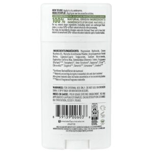 Hidróxido de magnésio, óleo de Cocos nucifera (coco), Maranta arundinacea (araruta) em pó, manteiga de butyrospermum parkii (karité), triglicerídeo caprílico / cáprico (óleo de coco fracionado), bicarbonato de sódio (bicarbonato de sódio), cera de Euphorbia cerifera (candelila), ésteres de Simmondsia chinensis (jojoba), óleo da fruta de Citrus aurantium bergamia (bergamota), óleo de Citrus aurantifolia (limão), tocoferol (vitamina E, derivada de girassol), betasitosterol, esqualeno.