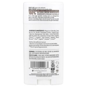 Hidróxido de magnésio, óleo de Cocos nucifera (coco), Maranta arundinacea (araruta) em pó, caprylic/capric triglyceride (óleo de coco fracionado), manteiga de Butyrospermum parkii (karité), bicarbonato de sódio (bicarbonato), cera de Euphorbia cerifera (candelila), ésteres de Simmondsia chinensis (jojoba), perfume (fragrância natural), tocoferol (vitamina E, derivado do girassol), betasitosterol, esqualeno.