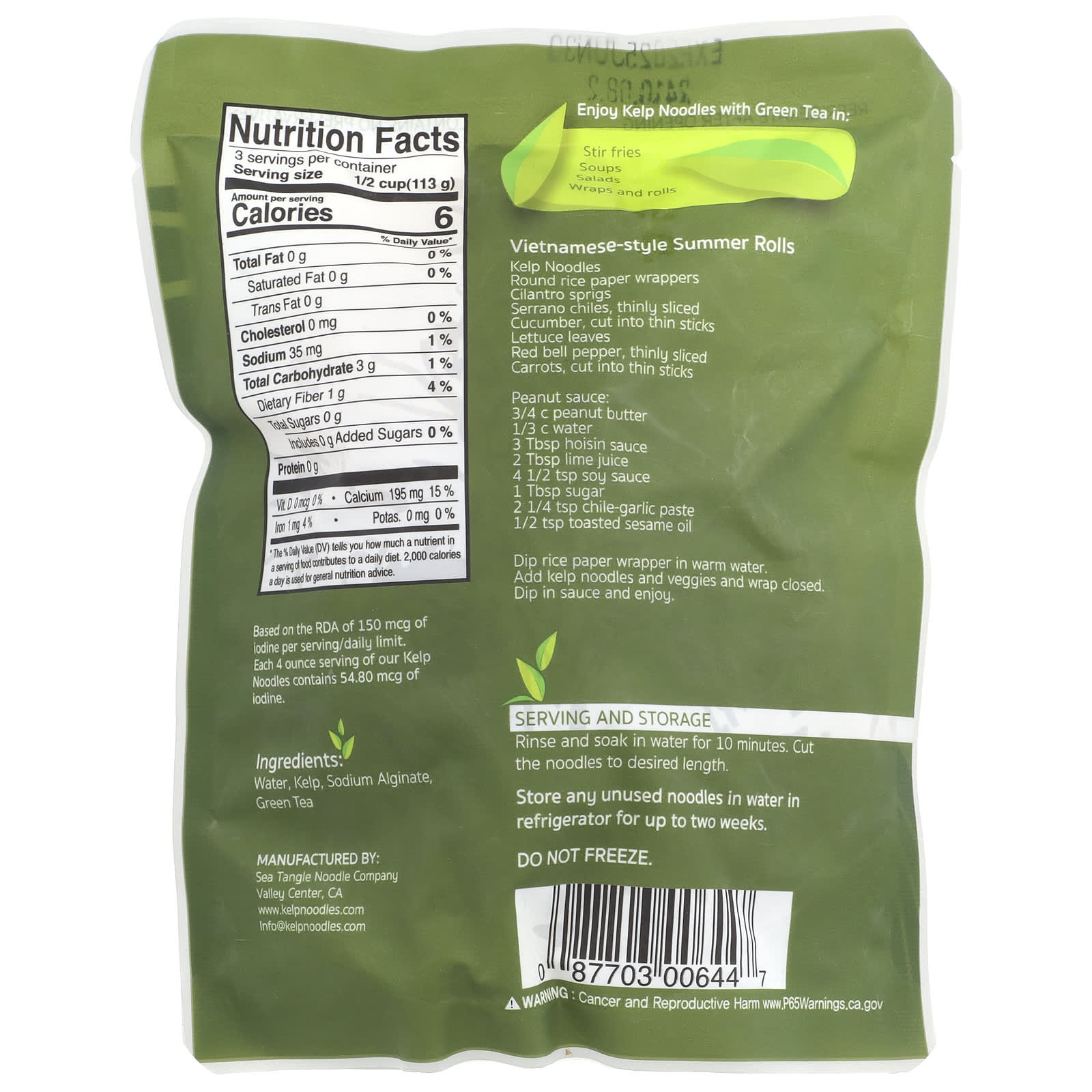 Com base na RDA de 150 mcg de iodo por porção / limite diário. Cada porção de 4 onças de nosso macarrão de alga marinha contém 54,80 mcg de iodo.