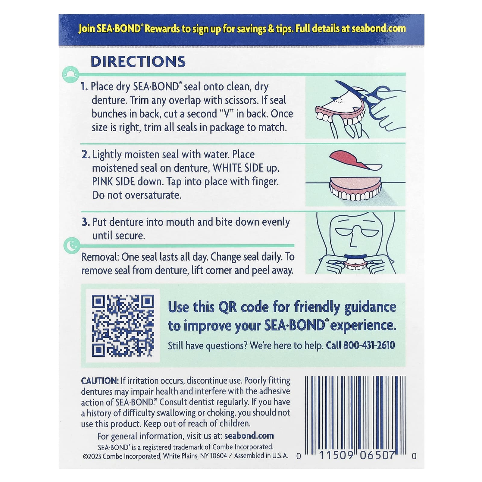 Em caso de irritação, descontinue o uso. Próteses dentárias mal ajustadas podem prejudicar a saúde e interferir na ação adesiva do Sea-Bond®. Consulte o dentista regularmente. Se você tiver um histórico de dificuldade para engolir ou engasgar, não deve usar este produto. Mantenha fora do alcance de crianças.