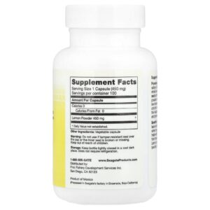 Processamento: Os limões Seagate são cultivados no interior dos vales da Baixa Califórnia. A Seagate liofiliza estes limões integrais (inclusive casca, polpa, sementes e suco) para fazer este concentrado de limões integrais contido em todas as cápsulas. Este é um processo muito delicado de baixa temperatura e alto vácuo, que remove apenas a umidade da fruta, mantendo todos os nutrientes importantes. Estes limões foram cultivados e processados sem nenhum químico.