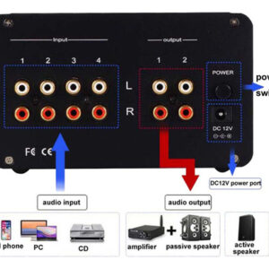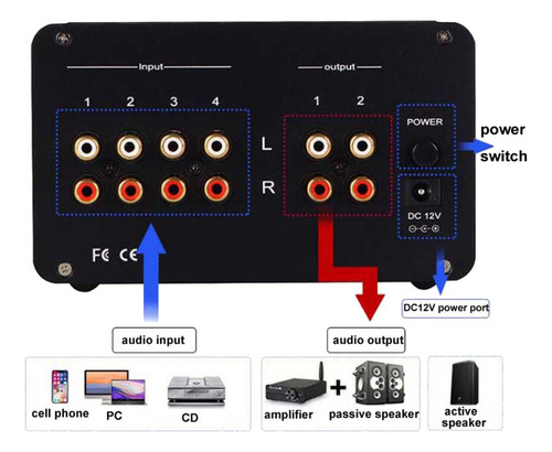 Potência máxima: 160mW/32ohm Relação sinal/ruído: Maior que 100DB (20DB) Hz-20kHz) Cor: B: preto Material: liga de alumínio Tamanho: 145 x 85 x 85 mm Conteúdo do pacote: 1 x Seletor de áudio
