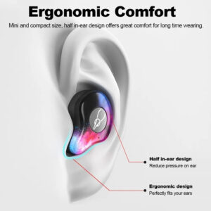 adotando 14.2mm alto-falante dinâmico, fornece excelente qualidade de som de baixo equilibrado, permite que você mergulhe em sua música, um ambiente tranquilo oferece melhor som. os fones de ouvido esquerdo e direito uma vez retirados do estojo de carregamento, e desligamento automático quando colocados na caixa. Conveniente para operar e rápido para emparelhar com dispositivos de áudio habilitados para BT.