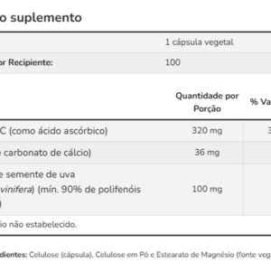 Cada cápsula contém 100mg de extrato de semente de uva, combinados com outros elementos cuidadosamente selecionados. Essa composição reflete o compromisso em oferecer um complemento alinhado às suas necessidades diárias. Validade longa