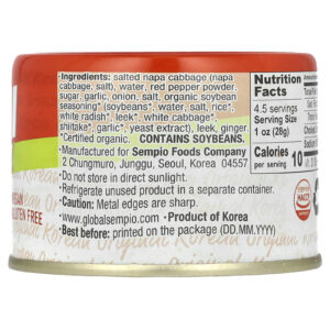 Repolho napa salgado (repolho napa, sal), água, pimenta vermelha em pó, açúcar, alho, cebola, sal, tempero de soja orgânico* (água de soja, sal, arroz*, rabanete branco*, alho-poró*, repolho branco*, shiitake *, alho*, extrato de levedura), alho-poró, gengibre.