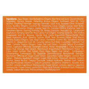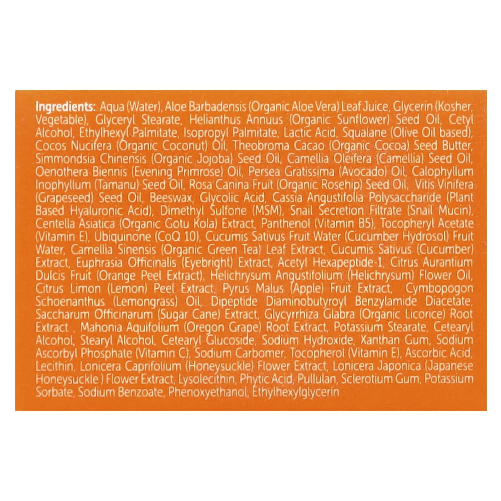 Aqua (água), suco da folha de Aloe barbadensis (babosa orgânica), glicerina (kosher, vegetal), monoestearato de glicerila, óleo da semente de Helianthus annuus (girassol orgânico), álcool cetílico, ethylhexyl palmitate, palmitato de isopropila, ácido láctico, esqualano (à base de óleo de oliva), óleo de Cocos nucifera (coco orgânico), manteiga da semente de Theobroma cacao (cacau orgânico), óleo da semente de Simmondsia chinensis (jojoba orgânica), óleo da semente de Camellia oleifera (camélia), óleo de Oenothera biennis (prímula), óleo de Persea gratissima (abacate), óleo da semente de Calophyllum inophyllum (tamanu), óleo da semente do fruto de Rosa canina (rosa-mosqueta orgânica), óleo da semente de Vitis vinifera (uva), cera de abelha, ácido glicólico, polissacarídeo de Cassia angustifolia (ácido hialurônico à base de plantas), dimethyl sulfone (MSM), filtrado de secreção de caracol (mucina de caracol), extrato de Centella asiatica (gotu kola orgânico), pantenol (vitamina B5), acetato de racealfatocoferol (vitamina E), ubiquinona (CoQ10), água da fruta Cucumis sativus (hidrosol de pepino), extrato da folha de Camellia sinensis (chá verde orgânico), extrato de Cucumis sativus (pepino), extrato de Euphrasia officinalis (eufrásia), acetyl hexapeptide-1, Citrus aurantium dulcis (extrato da casca de laranja), óleo da flor de Helichrysum angustifolium (Helichrysum), extrato da casca de Citrus limon (limão), extrato de fruta Pyrus malus (maçã), óleo de Cymbopogon schoenanthus (capim-limão), dipeptide diaminobutyroyl benzylamide diacetate, extrato de Saccharum officinarum (cana-de-açúcar), extrato da raiz de Glycyrrhiza glabra (alcaçuz orgânico), extrato da raiz de Mahonia aquifolium (uva oregon), potassium stearate, álcool cetoestearílico, álcool estearílico, glicopiranosídeo cetoestearílico, hidróxido de sódio, goma xantana, sodium ascorbyl phosphate (vitamina C), carbômer de sódio, tocoferol (vitamina E), ácido ascórbico, lecitina, extrato da flor de Lonicera caprifolium (madressilva), extrato da flor de Lonicera japonica (madressilva japonesa), lysolecithin, ácido fítico, pullulan, goma de esclerócio, sorbato de potássio, benzoato de sódio, fenoxietanol, ethylhexylglycerin.