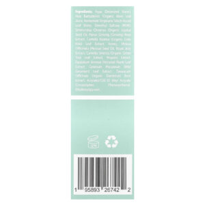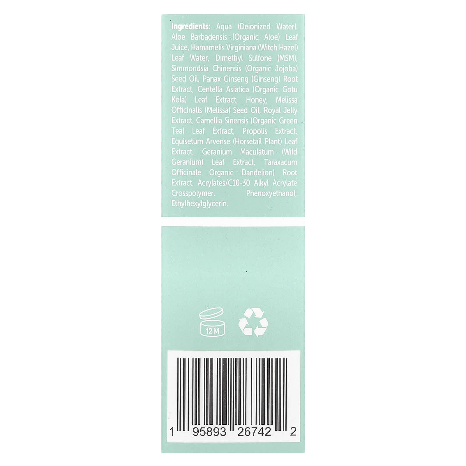 Aqua (água deionizada), suco da folha de Aloe barbadensis (aloe orgânica), água da folha de Hamamelis virginiana (hamamélis), dimetilsulfona (MSM), óleo da semente de Simmondsia chinensis (jojoba orgânica), extrato da raiz de Panax ginseng (ginseng), extrato da folha de Centella asiatica (gotu kola orgânico), mel, óleo da semente de Melissa officinalis (melissa), extrato de geleia real, extrato da folha de Camellia sinensis (chá verde orgânico), extrato de própolis, extrato da folha de Equisetum arvense (cavalinha), extrato da folha de Geranium maculatum (gerânio selvagem), extrato da raiz de Taraxacum officinale (dente-de-leão orgânico), acrylates/c10-30 alkyl acrylate crosspolymer, fenoxietanol, ethylhexylglycerin.