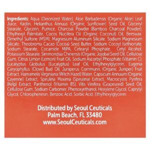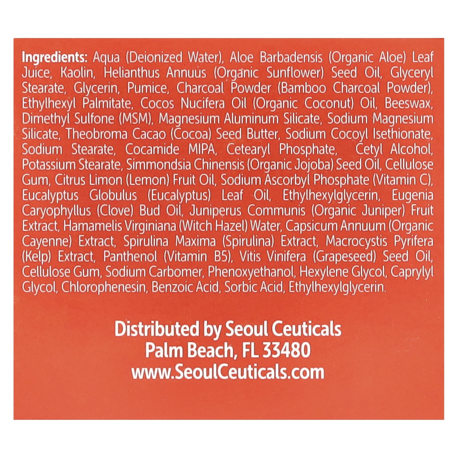 Aqua (água deionizada), suco da folha de Aloe barbadensis (aloe orgânica), caulim, óleo da semente de Helianthus annuus (girassol orgânico), monoestearato de glicerila, glicerina, pedra-pomes, pó de carvão vegetal (pó de carvão vegetal de bambu), ethylhexyl palmitate, óleo de óleo de Cocos nucifera (coco orgânico), cera de abelha, dimetilsulfona (msm), silicato de alumínio e magnésio, silicato de magnésio sódico, manteiga da semente de Theobroma cacao (cacau), sodium cocoyl isethionate, estearato de sódio, cocamide mipa, fosfato de dicetila, álcool cetílico, potassium stearate, óleo da semente de Simmondsia chinensis (jojoba orgânica), goma de celulose, óleo da fruta de Citrus limon (limão), sodium ascorbyl phosphate (vitamina C), óleo da folha de Eucalyptus globulus (eucalipto), ethylhexylglycerin, óleo do broto de Eugenia caryophyllus (cravo), extrato da fruta de Juniperus communis (zimbro orgânico), água de Hamamelis virginiana (hamamélis), extrato de Capsicum annuum (pimenta-caiena orgânica), extrato de Spirulina máxima (espirulina), extrato de Macrocystis pyrifera (alga castanha), pantenol (vitamina B5), óleo da semente de Vitis vinifera (uva), goma de celulose, carbômer de sódio, fenoxietanol, hexylene glycol, caprylyl glycol, clorfenesina, ácido benzoico, ácido sórbico, ethylhexylglycerin.