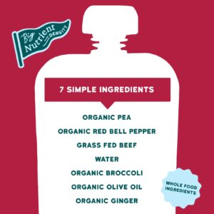 Ervilha orgânica, pimentão vermelho orgânico, gado criado no pasto, água, brócolis orgânico, óleo de oliva orgânico, gengibre orgânico.