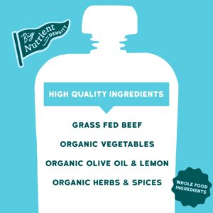 Água, carne bovina de gado criado no pasto, cenoura orgânica, pastinaca orgânica, batata branca orgânica, espinafre orgânico, suco de limão orgânico, óleo de oliva orgânico, cebola orgânica, alho orgânico, salsa orgânica, sal marinho do Himalaia, orégano orgânico, tomilho orgânico.
