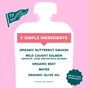 Abóbora-Menina orgânica, salmão selvagem (salmão coho e/ou keta), beterraba orgânica, água, óleo de oliva orgânico.
