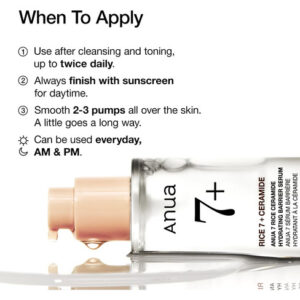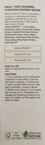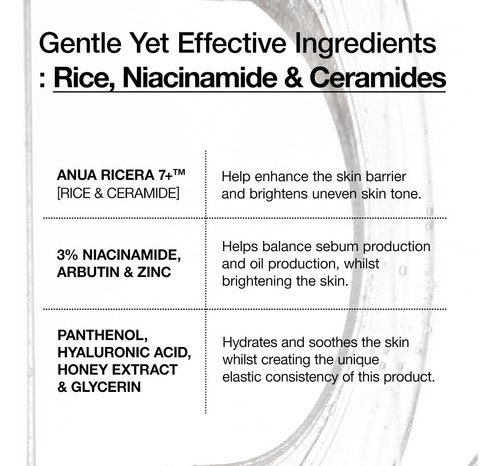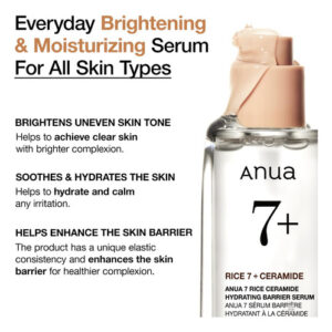 Sérum iluminador e hidratante com uma textura única para pele de vidro, formulado com extrato de arroz, niacinamida, ceramidas, ácido hialurônico, glicerina e zinco. – [SÉRUM ILUMINADOR DIÁRIO PARA TODOS OS TIPOS DE PELE] Formulado com ANUA RICERA 7+ e Arbutin, este sérum nutre e hidrata a pele enquanto ilumina a pele opaca para obter um tom de pele uniforme. – [ELÁSTICO EXCLUSIVO CONSISTÊNCIA] Uma mistura de extrato de mel, extrato de arroz e ácido hialurônico cria uma textura elástica única e leve deste sérum. – [CONTROLA O SEBO E O ÓLEO] Com 3% de niacinamida e zinco, este o sérum controla a oleosidade e o excesso de sebo, tornando-o adequado para pele oleosa para evitar manchas. – [REPARO DA BARREIRA CUTÂNEA] Com ceramidas e pantenol, este sérum repara a barreira cutânea danificada e protege a barreira cutânea de uma só vez. – [SUAVIZA E HIDRATA] Contém ácido hialurônico e glicerina para fornecer hidratação instantânea para obter uma pele vidrada. É livre de fragrâncias com ingredientes suaves, o que o torna adequado para uso diário de todos os tipos de pele, de manhã e à noite.