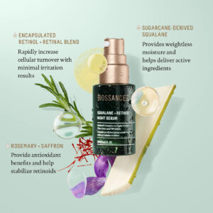 Uma fórmula inovadora com uma dupla encapsulada de retinol e retina de liberação prolongada, trabalhando para melhorar a aparência de linhas finas e rugas, descoloração e textura, com o mínimo de irritação.? Combinado com uma mistura antioxidante de esqualano e açafrão para hidratar a pele e aumentar o brilho. – Sérum noturno BioSSanceSqualane + Retinol. Uma fórmula inovadora com retinol e retina encapsulados de liberação prolongada para reduzir os sinais de envelhecimento com menos irritação. – Oferece resultados dramaticamente visíveis. Otimizados pela tecnologia de liberação prolongada, os retinóides penetram mais profundamente na pele enquanto são liberados gradualmente ao longo de 8 horas. – Feitos com ingredientes naturais e comprovados. Retinol e retinal encapsulados estimulam a renovação celular. O esqualano hidrata enquanto uma mistura de antioxidantes promove a saúde da pele. – Parte da sua rotina diária de cuidados com a pele. Aplique uma quantidade do tamanho de uma ervilha na pele limpa e seca à noite. Comece usando 2x por semana e aumente gradualmente. Siga com um hidratante e aplique SPF pela manhã. – Comprometido com a beleza limpa. Como parte do compromisso da BIOSSANCE com altos padrões para sua pele e o meio ambiente, todos os produtos são veganos, livres de crueldade e feitos sem parabenos, fragrâncias sintéticas ou PEG.