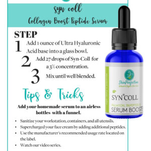Syn Coll Taxa de uso recomendada de 1 a 3% 0,5 fl. oz. O frasco conta-gotas de vidro azul Syn Coll foi projetado para renovar a aparência da pele, reduzindo a aparência de qualquer ruga. Syn Coll é o Tripeptídeo 5, que é um peptídeo anti-envelhecimento essencial que ajuda a pele a manter sua juventude. É obtido de fontes de peixes marinhos – as mais próximas do colágeno humano que você obtém. Apoie seus estoques de colágeno e estruturas faciais. Syn Coll também funciona bem com outros peptídeos, como o Matrixyl, promovendo uma aparência mais jovem. Faça seu próprio soro de colágeno antienvelhecimento com ácido hialurônico e outros peptídeos para combater as rugas e endurecer as rugas. Misture uma pequena quantidade de Syn Coll, junto com qualquer outro peptídeo, para dar um impulso ao seu produto antienvelhecimento ou tratamento de rugas. As instruções do produto e um guia de uso estão incluídos na compra. INCI: Tripeptídeo de palmitoílo-5, glicerina. – Peptídeo antienvelhecimento que aumenta o colágeno – este é o melhor ingrediente para usar com o Snap 8 e o Syn-Ake para reduzir a aparência das rugas. – O melhor intensificador de colágeno para ajudar a reduzir as rugas e o volume por dentro. Apoie os tipos de colágeno I, II, III, IV e V. Melhore a elasticidade com peptídeos eficazes. – Ingrediente antienvelhecimento para fazer seus próprios soros antienvelhecimento. Peptídeo antienvelhecimento que aumenta o colágeno – este é o melhor ingrediente para usar com o Snap 8 e o Syn-Ake para reduzir a aparência de rugas. – Suprimentos para fazer loções: adicione Syn-Coll a qualquer produto para a pele que você tenha ou faça sua fórmula do zero. Cremes noturnos, séruns diurnos, produtos de beleza e cosméticos para peles sem idade. – Este é um intensificador de sérum DIY. É um ingrediente único para a pele destinado à fabricação de loções. NÃO é um produto acabado e não pode ser devolvido devido a questões de saúde e segurança.
