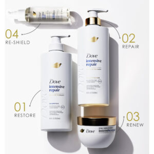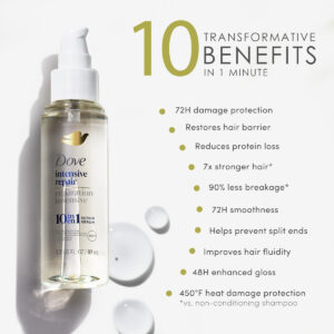 Sérum de aminoácidos Dove Intensive Repair para cabelos danificados com tecnologia de tratamento bioproteico de 3,3 onças – CABELO REPROTEGIDO: O sérum capilar Dove Intensive Repair para cabelos brilhantes reprotege o cabelo a cada uso para 72 horas de proteção contra danos e restaura a barreira capilar. – SÉRUM CAPILAR PARA CABELOS DANIFICADOS: Este é o melhor sérum capilar para reparação capilar. Formulado com Amino Serum, oferece brilho aprimorado em 48H e 72H de suavidade. – LIBIOPROTEIN CARE: Nossa linha de reparo intensivo* com tecnologia Bio-Protein Care, projetada para regenerar a força do cabelo e reabastecê-lo com 1 trilhão de fortalecedores de proteína a cada lavagem. *shampoo, condicionador/máscara e sérum — COMO USAR: Aplique de 1 a 3 doses do sérum Dove nos cabelos úmidos ou secos do meio às pontas. Para reparar e renovar ainda mais o cabelo, use a máscara capilar Dove Intensive Repair uma vez por semana. – REBORN STRONGER: os produtos capilares de reparo intensivo são um regime de 4 etapas criado para que você não tenha medo de danos. Restaurando, reparando, renovando e protegendo novamente para reduzir os sinais de danos. – CUIDADO COM O QUAL VOCÊ PODE CONTAR: Globalmente, a Dove não testa em animais. Este óleo sérico 10 em 1 da Dove, assim como todos os produtos para o cuidado do cabelo da Dove, são aprovados pela PETA e veganos.