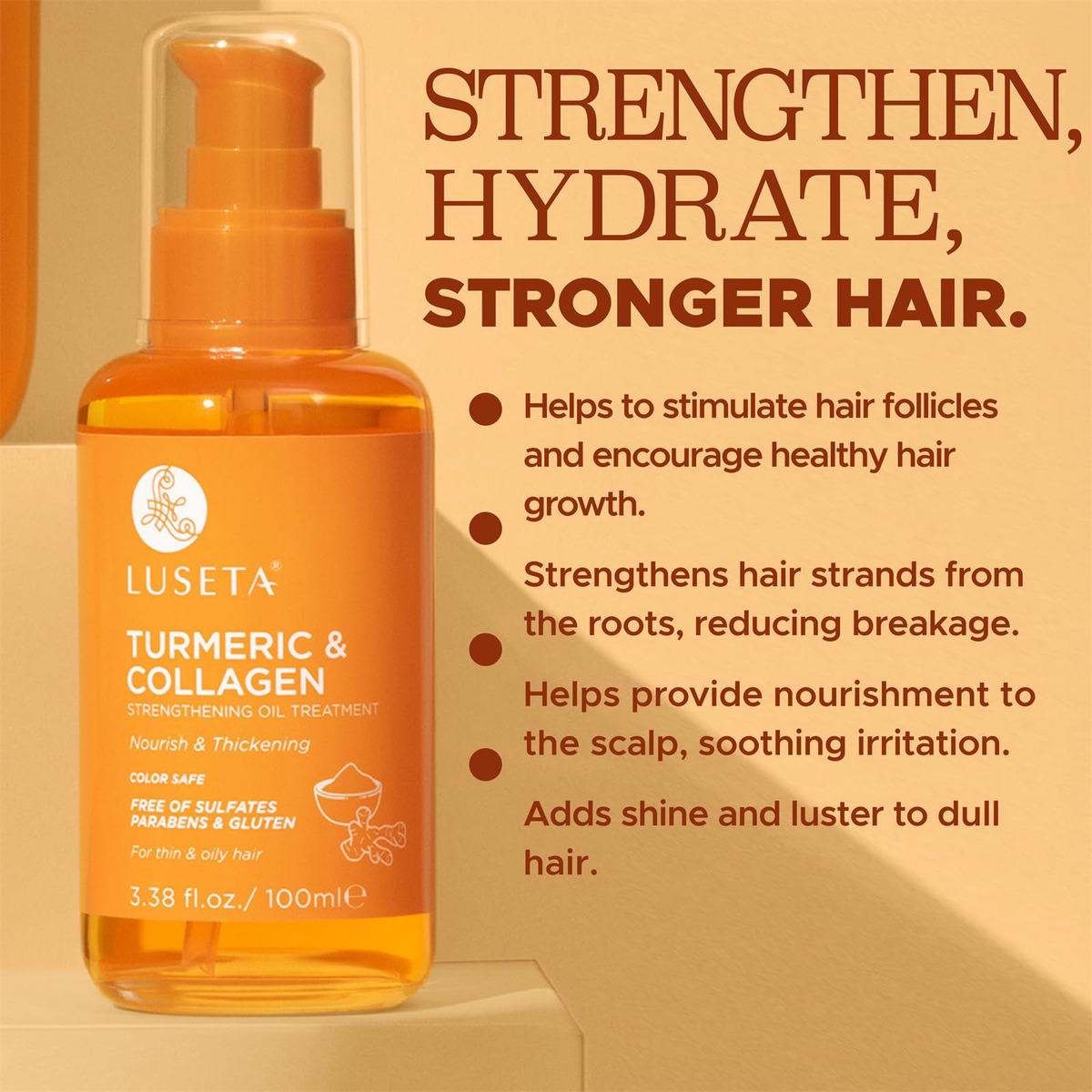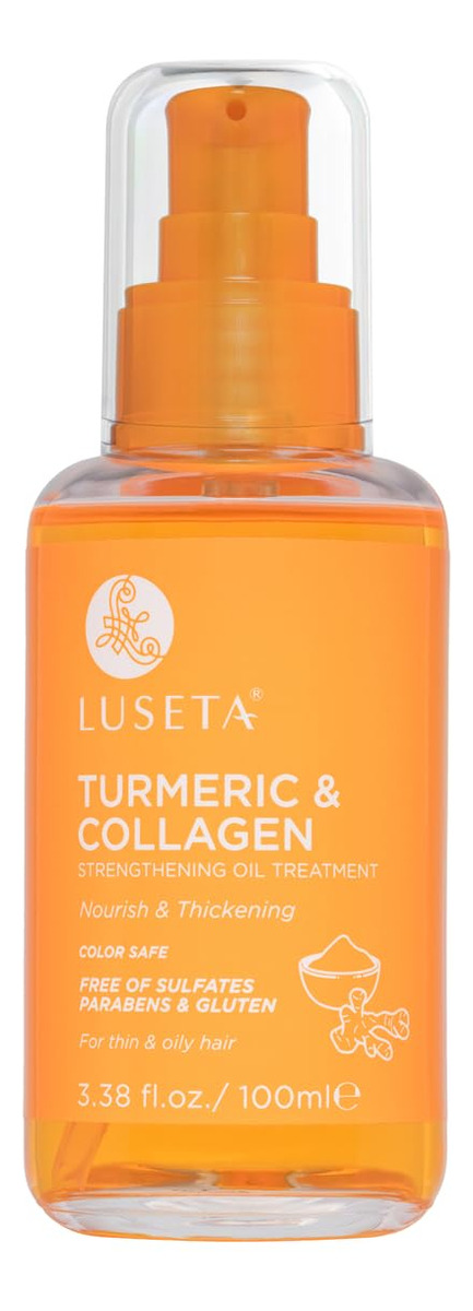 Nosso tratamento com óleo fortalecedor de cúrcuma e colágeno é um óleo leve e sem enxágue que ajuda a promover cabelos mais fortes, enriquecido com colágeno e açafrão para nutrição extra. Sua fórmula ajuda a evitar quebras e melhora a elasticidade para cabelos mais fortes e saudáveis. – FORTALECE E ENGROSSA: Para obter cabelos mais grossos e cheios para mulheres e homens, nosso óleo sérum para cabelos espessantes nutre e fortalece suavemente os cabelos finos e finos desde a raiz, reduzindo significativamente a queda de cabelo devido à quebra. Nosso sérum capilar contendo colégano ajuda a estimular os folículos capilares e estimular o crescimento saudável do cabelo. – Hidratante e volumizante: este óleo espessante foi desenvolvido para ajudar você a obter uma aparência mais cheia, adicionando brilho e brilho aos cabelos opacos. Combine com nosso conjunto de xampu e condicionador para uma rotina de cuidados com os cabelos que dá volume e hidratação. – PARA CABELOS E COURO CABELUDO OLEOSOS: Este óleo sérum de rotina ajuda a eliminar resíduos e se acumular. Feito sem sulfatos ou parabenos que podem prejudicar o couro cabeludo ou o cabelo. E também ajuda a nutrir o couro cabeludo, aliviando a irritação. – QUALIDADE DO SALÃO: Feito com extrato de açafrão, tollágeno tidrolisado, o açafrão é conhecido por seus benefícios à saúde, incluindo suavização e hidratação, o colágeno é um tipo de proteína que promove a saúde do cabelo, da pele e das articulações. Sua fórmula ajuda a evitar quebras e melhora a elasticidade para cabelos mais fortes e saudáveis. – Seguro de cor: funciona em todos os tipos de cabelo. Este sérum de óleo de cabelo sem cor também é adequado para cabelos tingidos e tratados com cores. O sérum capilar de cúrcuma e colágeno da Luseta para cabelos tingidos ajuda você a alcançar um equilíbrio entre coloração e cuidados com os cabelos.