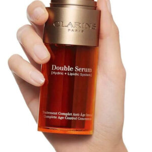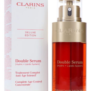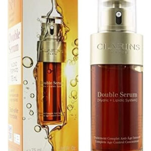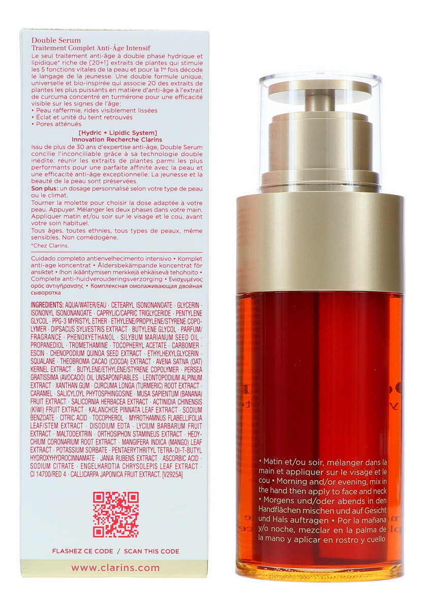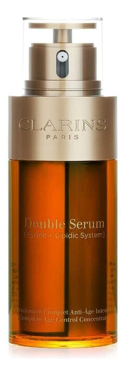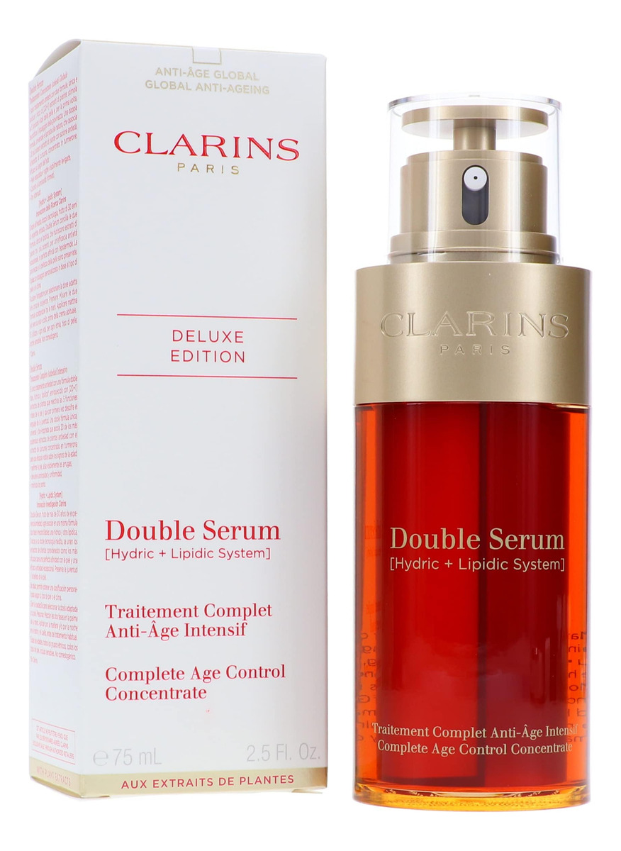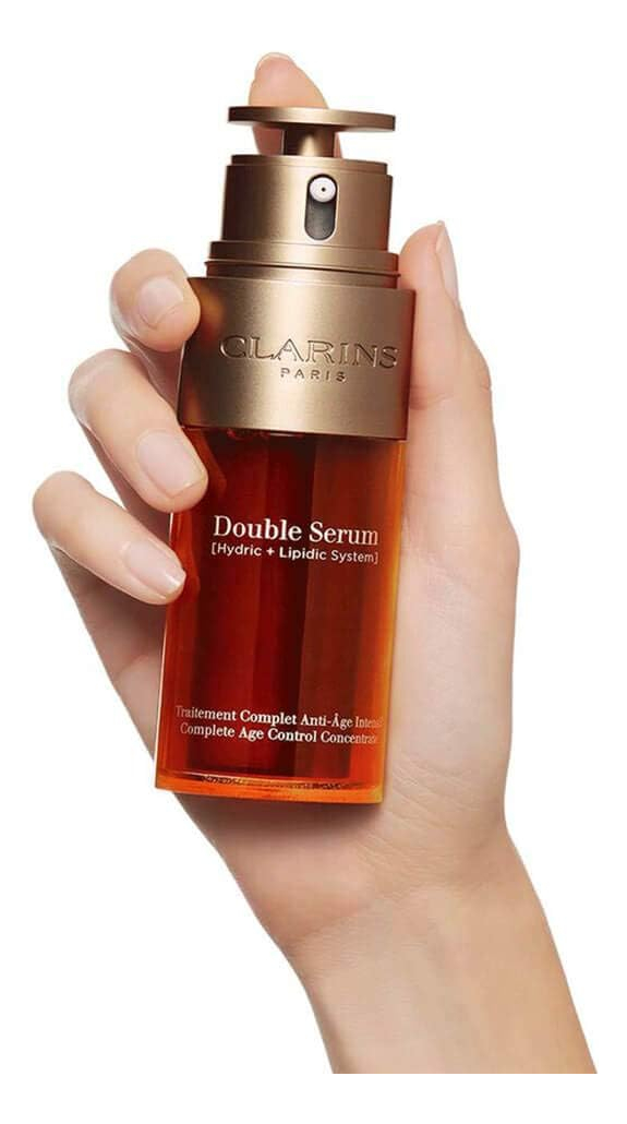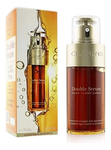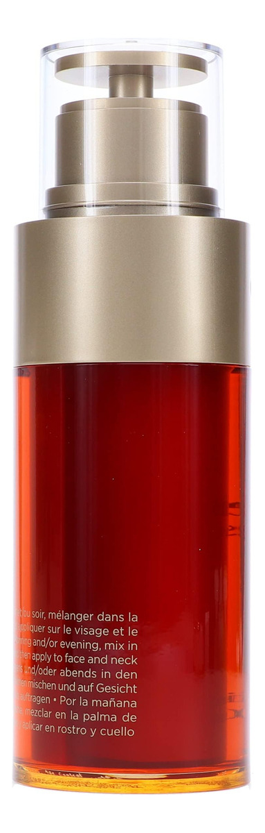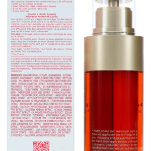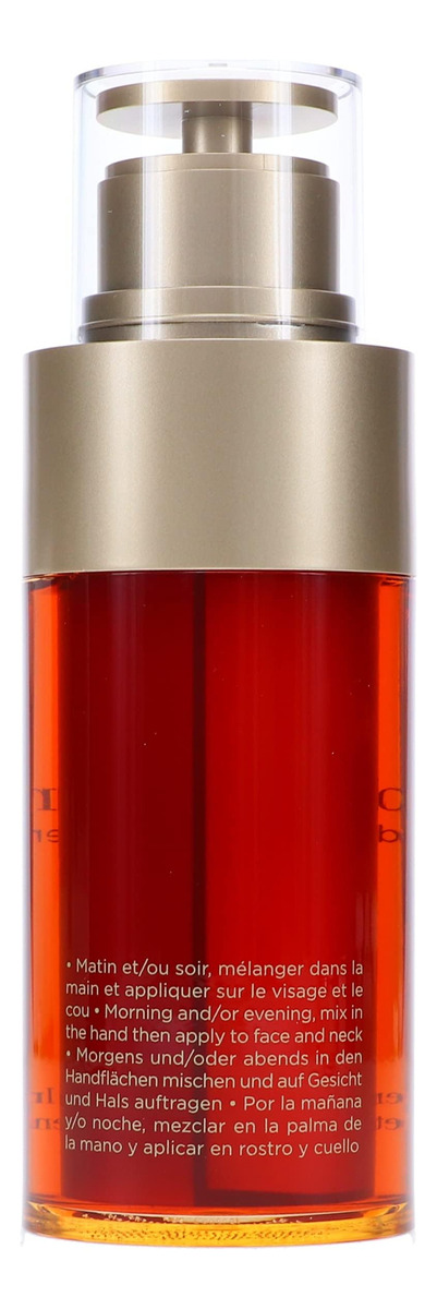 Sérum duplo Clarins | Premiado | Antienvelhecimento | Firma, suaviza e aumenta visivelmente o brilho em apenas 7 dias* | 21 ingredientes vegetais, incluindo açafrão | Todos os tipos, idades e etnias de pele – Resultados: reduz visivelmente as rugas, promove a firmeza da pele, revive o brilho, hidrata e suaviza, fecha visivelmente os poros; a fórmula exclusiva de duas fases é inspirada na água dupla e natureza da pele; a icônica câmara dupla abriga a proporção perfeita de ingredientes solúveis em água (hídricos) e solúveis em óleo (lipídicos), semelhante ao filme hidrolipídico da pele – Uma vez dispensados, os dois concentrados se combinam em um soro poderoso que é facilmente absorvido pela pele e combate com eficácia todos os sinais visíveis de envelhecimento da pele; a cúrcuma trata todos os sinais visíveis de envelhecimento da pele; um trio estimulante da juventude de banana orgânica, teasel e aveia orgânica firma, levanta e combate visivelmente as linhas finas e rugas; uma mistura reconfortante de abacate, manga e kiwi orgânico suaviza e nutre es – A folha de vida orgânica aumenta a hidratação natural da pele; uma fusão de Beautyberry, goji berry orgânico e castanha-da-índia energiza, elimina toxinas, e revive o brilho, Red Jania, Huang Qi e Orthosiphon ajudam a eliminar as células mortas da pele, purificam e refinam visivelmente a textura da pele e matificam a pele; adequado para todas as idades, etnias e todos os tipos de pele, mesmo as mais sensíveis; siga com um hidratante para aumentar os resultados — um sérum revitalizante exclusivo de fase dupla