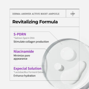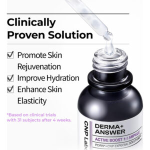PDRN and CNPs Expert Solution infused ampule – CNP DERMA ANSWER ACTIVE BOOST AMPULE (30ml/1.01fl oz) – CNP Derma Answer Active Boost Ampule rejuvenates skin by targeting aging signs, enhancing elasticity, and diminishing the appearance of fine lines, revealing a youthful appearance in just 4 weeks. – PDRN POWERHOUSE – Enriched with S-PDRN for advanced absorption and Expecial Solution for robust energy delivery, this ampoule is crafted to penetrate deeply, addressing various skin concerns effectively. – TARGETED SKIN IMPROVEMENTS – Offers firming and moisture-locking properties, while also strengthening the skin barrier and improving skin density. Regular use leads to a firmer, and more even-toned complexion. – PROVEN & SAFE – Dermatest-certified with an Excellent grade, this ampoule is ideal for all skin types, including sensitive skin, thanks to its soothing and calming properties, ensuring top-tier skincare results with every application. – CNP – Dedicated to improving skin at home, CNP leverages years of research to craft formulations that target specific skin concerns. With a focus on concentrated active ingredients, it ensures vitality and resilience, providing effective, science-backed solutions for various skin issues.