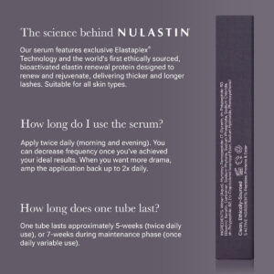 Este sérum para cílios é orgulhosamente desenvolvido com a tecnologia Elastaplex. Este ingrediente ajuda esse sérum para melhorar os cílios a suportar todos os estágios do ciclo natural de crescimento dos cílios, ao mesmo tempo que ajuda a ancorar e unir os folículos cílios na raiz, reduzindo visivelmente a queda e a queda. Dessa forma, os fãs podem usar esse soro para cílios para ajudar a proteger os cílios existentes e trabalhar para obter cílios com aparência mais longa. Os usuários podem começar a ver resultados visíveis em menos de seis semanas após começarem a usar este soro para cílios. Além da tecnologia Elastaplex, esse sérum para melhorar os cílios também se beneficia de outros ingredientes importantes, como um peptídeo sinalizador bioprojetado, que ajuda a fortalecer os cílios e melhorar a cor natural dos cílios, além de aumentar a densidade visível dos cílios. O sérum para cílios também usa elastina bioprojetada, que é uma proteína biomimética de elastina de comprimento total que ajuda a suplementar a elastina onde ela é mais necessária para ancorar o folículo cílio. Portanto, se você está curioso para experimentar um sérum visivelmente alongador de cílios, considere experimentar esta fórmula. – Sérum para melhorar os cílios – Este sérum revolucionário ajuda a estimular cílios com aparência mais longa, ao mesmo tempo em que reduz a queda visível e rejuvenesce a elastina. A elastina fixa o cabelo para ajudar a proporcionar cílios visivelmente mais fortes, brilhantes e espessos. – Estudado cientificamente – Nossos resultados foram testados clinicamente em vários ensaios científicos. Em uma avaliação clínica de 12 semanas, os participantes experimentaram um aumento de 60% na aparência do comprimento dos cílios após o uso deste sérum para melhorar os cílios.* – Apoie cílios saudáveis – Este novo sérum para cílios usa cinco ingredientes ativos e sinérgicos para auxiliar em todas as fases do ciclo natural de crescimento. É ativado com a primeira proteína de renovação de elastina bioprojetada e de origem ética para rejuvenescimento capilar. – Como usar – Comece com pálpebras limpas e secas. Use o aplicador para aplicar uma linha fina do sérum para cílios na base da linha superior dos cílios, do canto interno para o externo. Aplique duas vezes ao dia, reduza para uma vez quando atingir a aparência desejada. Não recomendado para uso nos cílios inferiores, pois pode causar irritação. – Ciência real para resultados reais – A ciência inovadora da Nulastin está enraizada na reposição de elastina para realçar o cabelo. Oferecemos de tudo, desde soros para cílios a fórmulas nutritivas para cabelos finos e sobrancelhas esparsas.