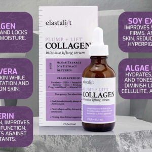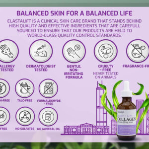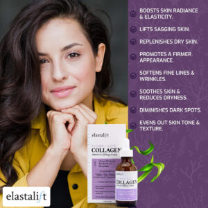 Dê uma bota nas suas rugas Criada por mulheres cansadas de ouvir ordens para encobrir imperfeições, a Elastalift foi criada para ajudar a descobrir a beleza existente. Este soro elevador de colágeno faz exatamente isso. Diminui a aparência das rugas, desde as rugas profundas que revestem a testa até as linhas finas ao redor dos olhos. Levante e hidrate a pele flácida até obter um brilho jovem com Elastalift! Ingredientes que você conhece e adora Dê à sua pele o impulso nutritivo de que ela precisa para se refrescar com colágeno e alguns dos produtos de cuidado da pele mais antigos e verdadeiros: extratos naturais puros! O extrato de maçã oferece o tom de pele uniforme que você deseja. É rico em vitamina C, que ilumina a aparência da pele opaca e envelhecida. O extrato de folha de alecrim promove a cura interna, melhorando a circulação. O extrato de girassol acalma a pele que ficou áspera ao longo dos anos. Além disso, protege a pele dos danos futuros causados pela luz solar! O extrato de casca de laranja rejuvenesce a aparência da pele, pois seus ácidos cítricos esfoliam suavemente. Mantenha seus cuidados com a pele limpos Os produtos de cuidado da pele limpos são o que transformam a pele problemática em pele perfeita! Mesmo para quem tem pele sensível, este soro hidratante de colágeno é seguro para você, pois é livre de substâncias químicas nocivas. Nenhum PEGs, formaldeído, sulfatos, triclosan ou propilenoglicol danifica sua pele com Elastalift! Nunca é cedo demais para prevenir rugas É muito mais fácil evitar as rugas do que tratá-las. Não importa quantos anos você tem ou quantas rugas você tem, este sérum preenchedor e hidratante fornece à sua pele os blocos de construção necessários para retardar e reverter os sinais de envelhecimento! Cuidados simples com a pele são os melhores cuidados com a pele – PELE PERFEITAMENTE RECHONCHUDA Você sonha com os anos em que as rugas e linhas finas traíram sua idade? Reviva a pele firme, brilhante e linda de sua juventude com o Sérum Lifting de Colágeno Elastalifts! O colágeno devolve à pele sua beleza anterior, estimulando a produção vital de elastina, tornando-a gorda e viva. SEGURO PARA PELES SENSÍVEIS. O tempo priva a pele de sua resiliência, tornando-a cada vez mais frágil com o passar dos anos; não escolha um sérum antirrugas repleto de produtos químicos agressivos e nocivos. Não é oleoso e de fácil absorção Com os muitos óleos faciais, séruns e hidratantes que compõem sua rotina de cuidados com a pele, aplique camadas sobre o produto O produto posterior pode deixar sua pele oleosa e sufocada; mas isso não é um problema com o sérum para pele não oleoso e de rápida absorção da Elastalift! – OS MELHORES INGREDIENTES DA NATUREZA Os extratos ricos em nutrientes encontrados na natureza aprimoram as propriedades incríveis do colágeno; a soja se une ao colágeno para firmar a pele flácida, enquanto o extrato de algas ilumina e aperfeiçoa o tom da pele; e para um brilho úmido final, a glicerina hidrata ao máximo