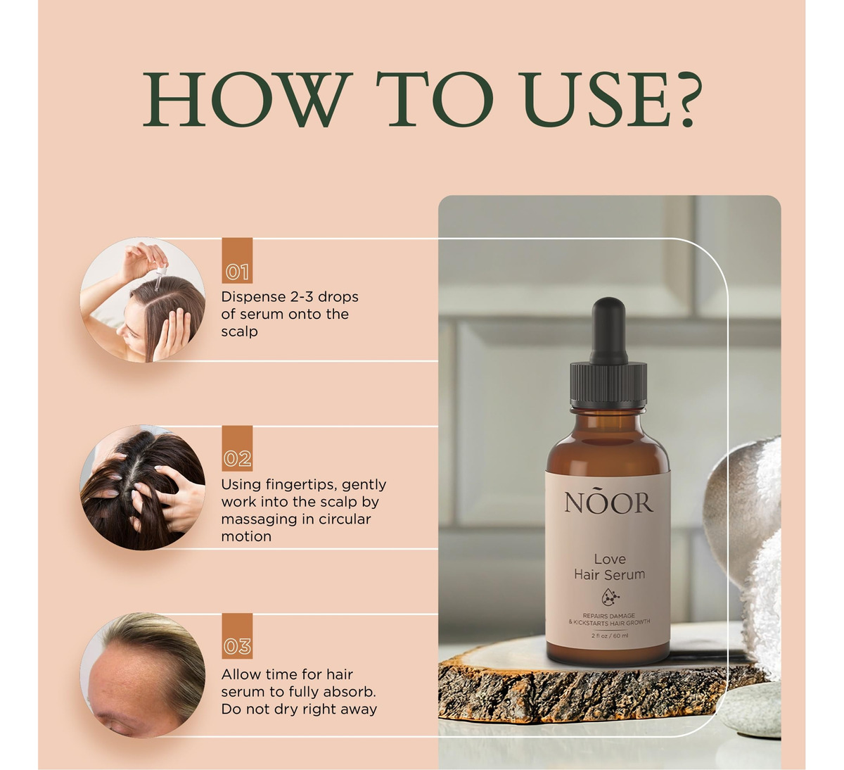 Transforme sua jornada de crescimento capilar como milhares de americanos com o óleo de cabelo Noor's Love Serum para o crescimento do cabelo, o remédio inovador de óleo de cabelo à base de azeitona africana que visa a causa raiz da queda de cabelo para mulheres. Em apenas 4 semanas, o sérum de óleo de argan da Noor combate os “folículos estressados” que causam queda de cabelo, revitalizando seus cabelos independentemente da idade, textura ou condição do cabelo. Os ingredientes poderosos do Noor Hair Growth Serum, incluindo óleo de argan africano e aloe vera, nutrem e fortalecem seu cabelo enquanto promovem brilho e elasticidade incríveis – o tratamento perfeito para queda de cabelo. Não perca esta oportunidade de dizer adeus aos cabelos esparsos, secos e danificados e olá a um cabelo mais cheio e confiante. Descubra o segredo de um cabelo mais espesso e gostoso com o sérum de crescimento capilar Noor. – Sérum de azeitonas espanholas antigas – Cansado de experimentar todos os tratamentos para queda de cabelo? O sérum Noor's Ancient Hair Growth aproveita o poder das azeitonas espanholas para combater todos os tipos de queda de cabelo, independentemente da idade ou tipo de cabelo. Junte-se a milhares de mulheres que já estão passando por transformações incríveis! – Transforma o cabelo em menos de 4 semanas – Com o soro capilar Noor's, seu cabelo pode passar de irregular a abundante em menos de 30 dias. É um divisor de águas no mundo do crescimento capilar, ajudando você a combater a queda de cabelo induzida pelo estresse e a descobrir o segredo de mechas deliciosas. – Estimula naturalmente o crescimento do cabelo – Noor trabalha em harmonia com seu corpo, desestressando seus folículos e revivendo o crescimento do cabelo sem um acabamento oleoso. Não se contente com suplementos ineficazes do passado. Aplique uma vez ao dia para obter resultados eficazes que não pareçam gordurosos. – Milhares de resultados comprovados – A consistência é fundamental. Aplique suavemente o óleo de crescimento capilar nas raízes do cabelo antes de massagear. Siga consistentemente uma vez ao dia por um mínimo de 3 meses para obter os melhores resultados de crescimento capilar, comprovados pela fórmula antiga apoiada pela ciência.