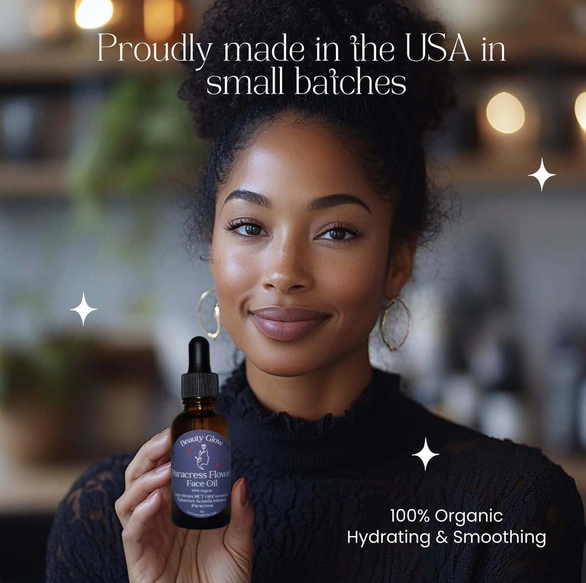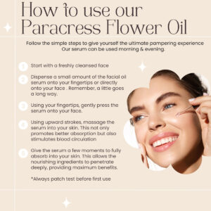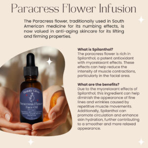 Nosso óleo de flor com infusão de Paracress é feito nos EUA com todos os ingredientes orgânicos. Escolhemos o método de infusão de óleo porque ele não usa álcool tóxico para extrair o espilantol. Devido às suas propriedades solúveis em óleo, o Spilanthol pode ser extraído da flor com um método de infusão de óleo, tornando-o uma escolha segura para pessoas com pele sensível. A flor Paracress, historicamente usada na medicina sul-americana por seus efeitos entorpecentes, não é valorizada em cuidados antienvelhecimento para a pele por seus benefícios relaxantes naturais para a pele. Rico em espilantol, esse extrato rico em antioxidantes oferece benefícios miorrelaxantes, que podem ajudar a aliviar a tensão nos músculos faciais para retardar e reduzir a aparência de linhas finas, rugas e linhas de expressão. O agrião orgânico é infundido no óleo MCT orgânico, conhecido por suas propriedades hidratantes. É um óleo leve e não oleoso, adequado para todos os tipos de pele e não obstrui os poros. O óleo MCT contém ácidos graxos nutritivos para melhorar a aparência da textura da pele e revelar uma tez radiante e brilhante. – Nosso óleo de flor com infusão de Paracress é feito nos EUA com todos os ingredientes orgânicos. Escolhemos o método de infusão de óleo porque ele não usa álcool tóxico para extrair o espilantol. Devido às suas propriedades solúveis em óleo, o espilantol pode ser extraído da flor com um método de infusão de óleo, tornando-o uma escolha segura para pessoas com pele sensível. – A flor de agrião, historicamente usada na medicina sul-americana por seus efeitos anestesiantes, agora é valorizada em cuidados antienvelhecimento por seus benefícios relaxantes naturais para a pele. – Rica em espilantol, este extrato rico em antioxidantes oferece benefícios miorrelaxantes, que pode ajudar a aliviar a tensão nos músculos faciais para retardar e reduzir a aparência de linhas finas, rugas e linhas de expressão. – O o paracress orgânico é infundido em óleo MCT orgânico, conhecido por suas propriedades hidratantes. É um óleo leve e não oleoso, adequado para todos os tipos de pele e não obstrui os poros. O óleo MCT contém ácidos graxos nutritivos para melhorar a aparência da textura da pele e revelar uma tez radiante e brilhante.
