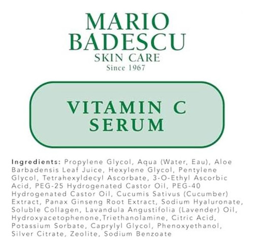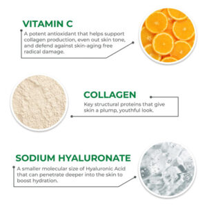 • [formulado com] vitamina C, colágeno e hialuronato de sódio para hidratar a pele, enquanto diminui a aparência de linhas finas e rugas