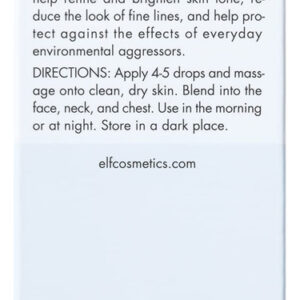 Sérum de prevenção da poluição por vitamina C e.l.f. Cosmetics Beauty Shield, branco, 0,95 fl oz (pacote com 1) — Este sérum de vitamina C ilumina o tom da pele e ajuda a pele a manter um brilho jovem. — Protege contra os efeitos dos agressores ambientais diários. — Formulado com os principais antioxidantes, vitamina C, vitamina E e extrato de romã. — Aplique 4-5 gotas e massageie na pele limpa e seca, de manhã ou à noite. Os produtos e.l.f. são feitos com ingredientes que amam a pele que você deseja a preços bons para você. Todos os produtos da e.l.f. são 100% veganos, livres de crueldade e certificados pela Leaping Bunny.